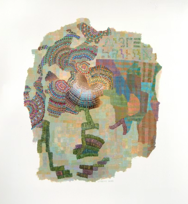 Up until recently, I tended to work in an impressionistic way in relation to these sources. They would get filtered through my imagination, a kind of background to the ideas I’d be trying to connect in a painting. While engaging with the collection at Museum London for my recent exhibition there, I found it more interesting to respond specifically to particular works, mostly 18th and 19th century embroidery samplers from Southwestern Ontario. I’d study the pieces in detail, repeating or adapting some of the motifs as a way to make connections across time (example, Mackie’s Birds [Remix], 2024, Echoers and Off Grid, both 2025).”
