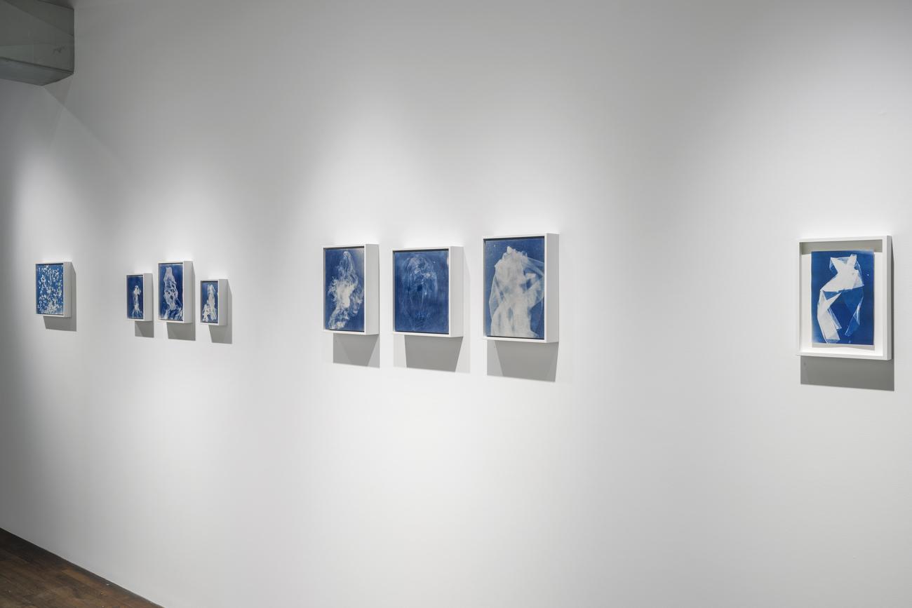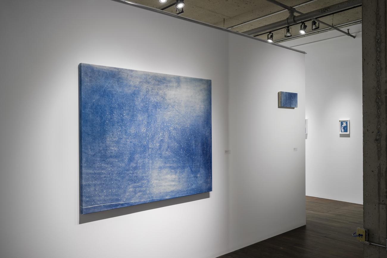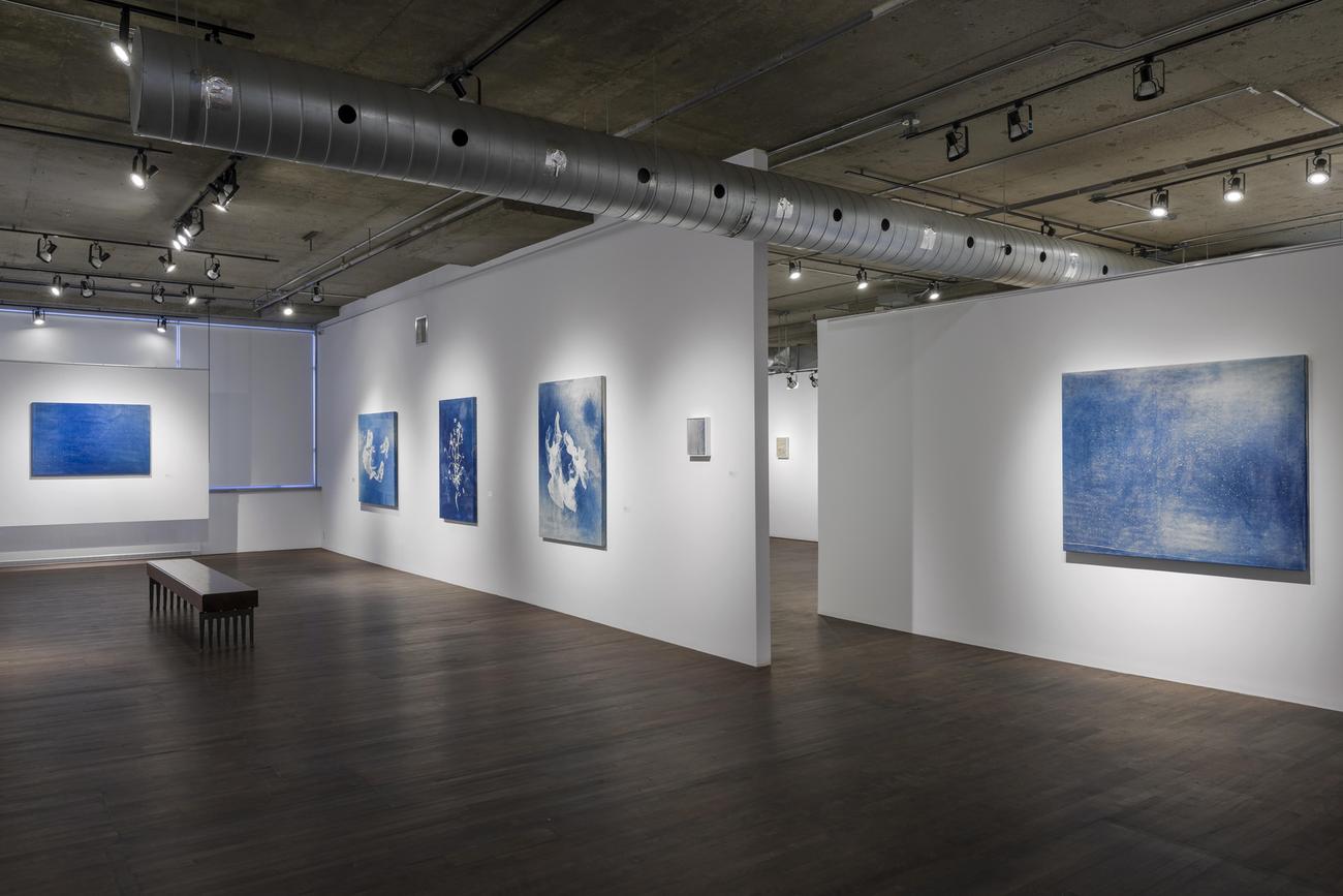 Dans cette exposition, Natalja Scerbina présente un corpus d’une trentaine d’œuvres réalisées selon le procédé du cyanotype, sur papier et sur toile. Mise au point en 1842 par le scientifique britannique John Herschel, cette technique ancienne est notamment associée à Anna Atkins, pionnière de la photographie botanique, qui l’a utilisée pour créer une véritable encyclopédie d’images végétales. Le cyanotype repose sur une réaction photosensible : un support préalablement enduit d’une solution chimique devient sensible à la lumière. Une fois exposé au soleil ou à une source de rayons UV, il révèle une image aux nuances caractéristiques de bleus profonds, communément appelée bleu de Prusse.