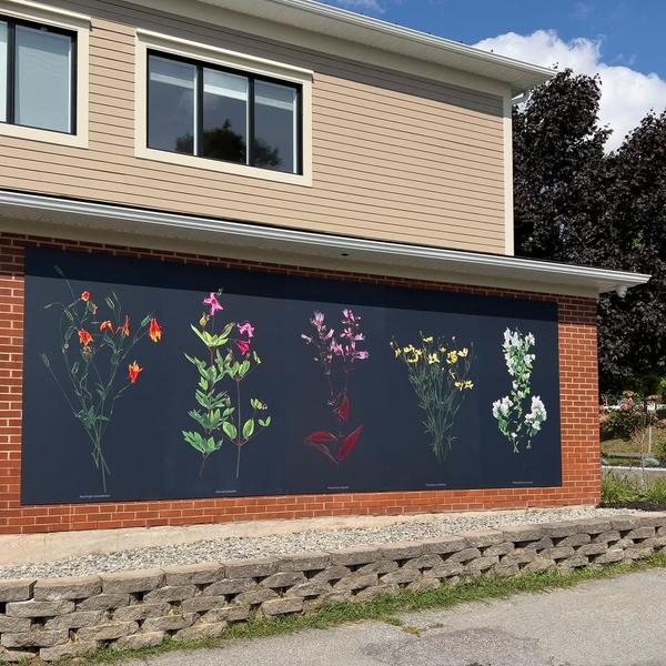 Inauguration of the architectural integration project: “A Reinvented Herbarium” at Austin Town Hall in the Eastern Townships. One of the building's exterior walls is adorned with a work of art. It is a large-scale photographic fresco, composed of five panels, evoking both the richness of the local flora and traditional Japanese floral art. By magnifying Quebec's native flowers, artist Bertrand Carrière offers a poetic vision of nature that transforms the space into a living, luminous place conducive to contemplation.
